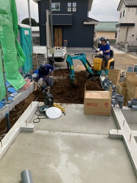 ■屋外配管作業は取り回しがよい小型ユンボが活躍中。